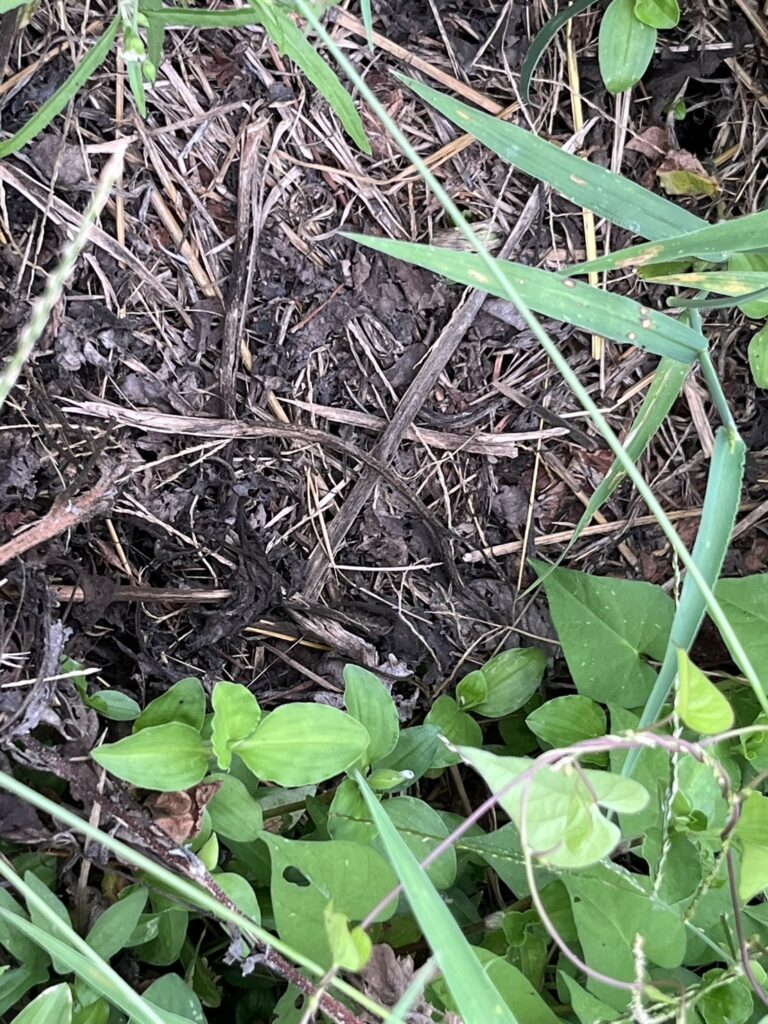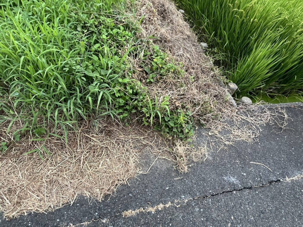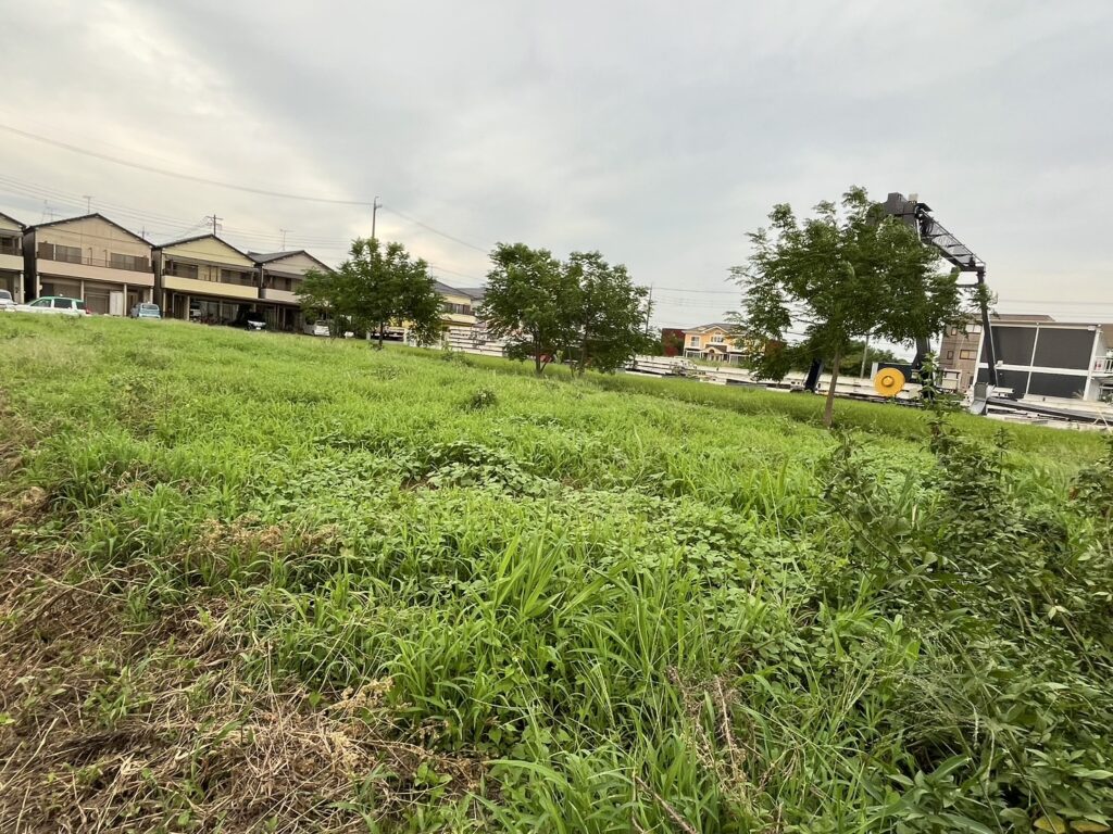 奥の方の地面に草が茂り隣地との境目が不明です。
