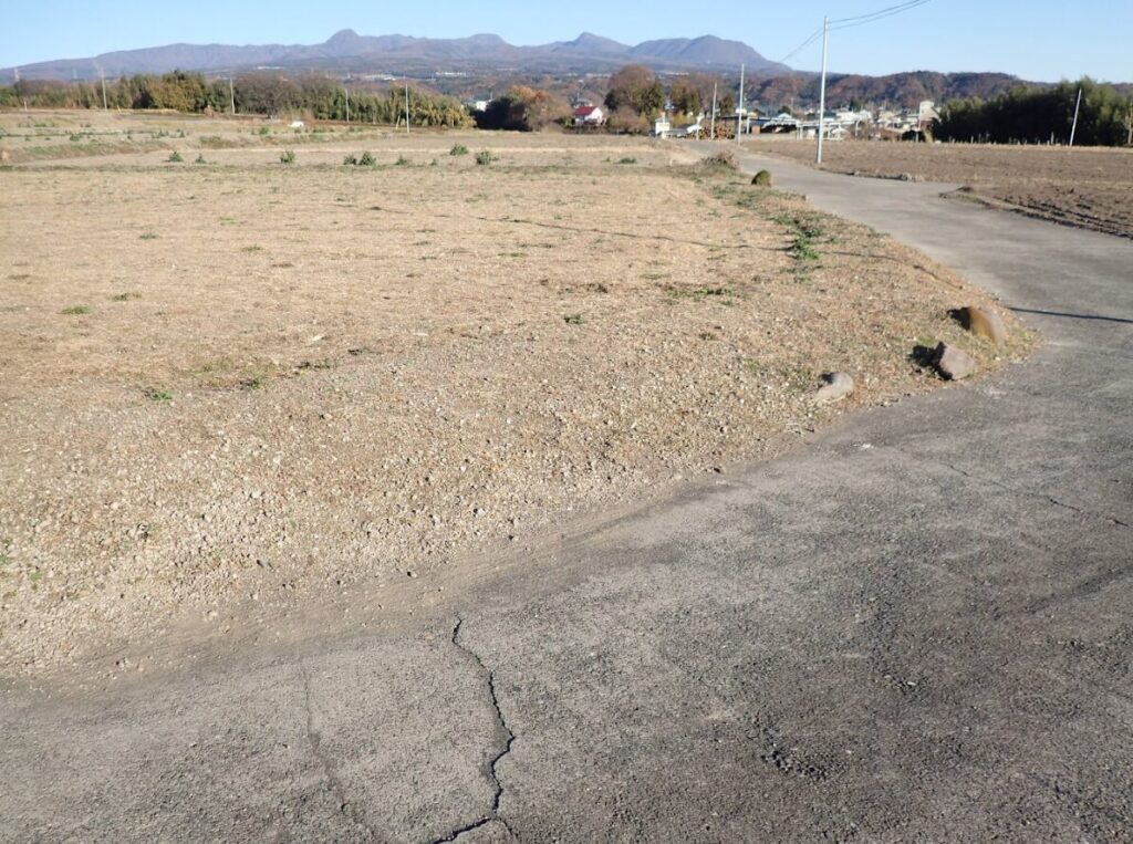 四角又はそれに近い形で平坦です, 周囲の土地(北側)と高低差があります(目安:車で通れない程度)。土地改良済の農地です。