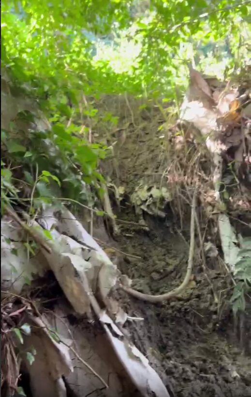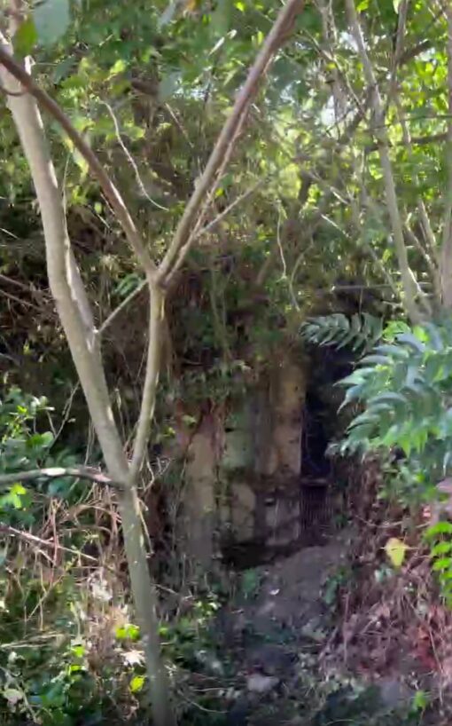 宅地は細い四角形型の土地で、草木がうっそうと茂っており、該当地付近はこう配や傾斜になっています。