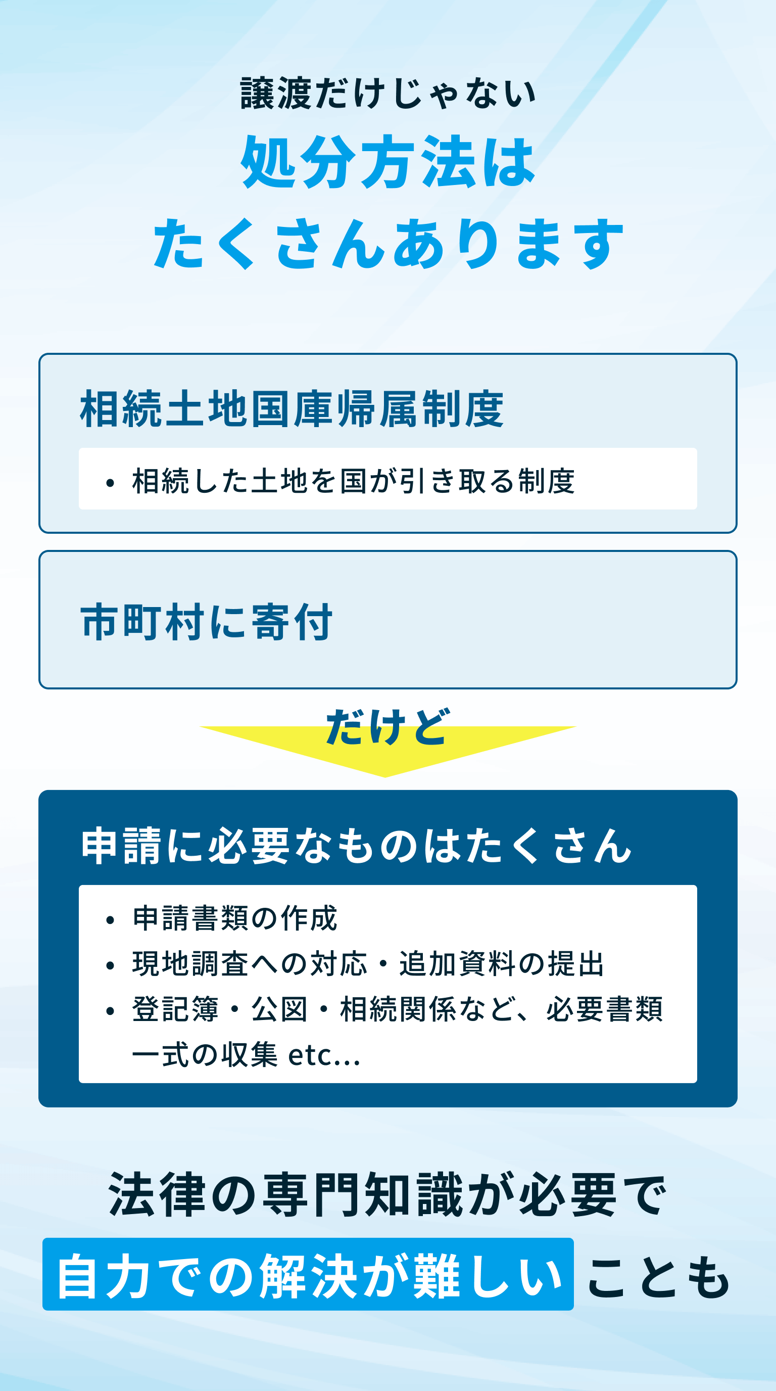 国庫帰属制度と複数の掲示板を並行して利用しました。進め方や契約・名義変更まで、担当の方に任せっきりでも処分できました。